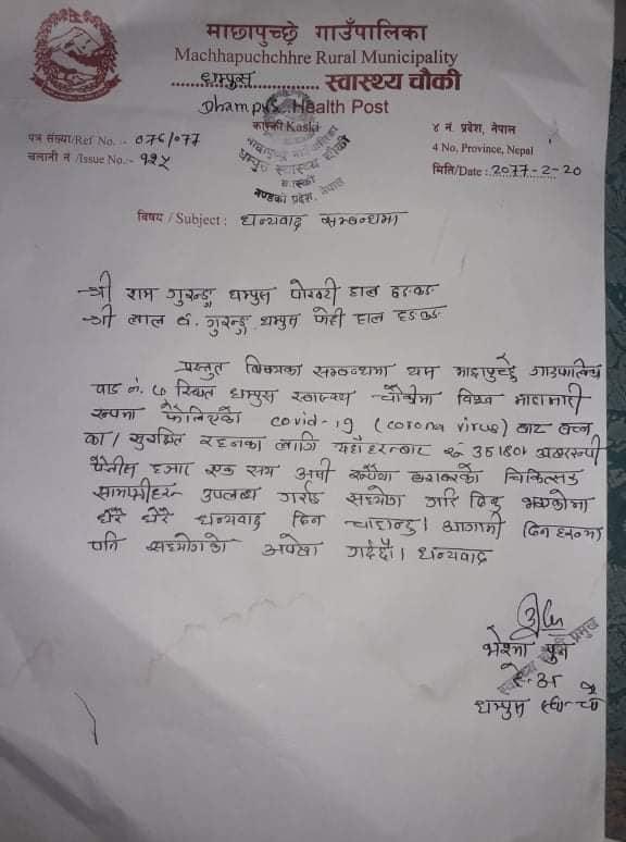यस धम्पुस स्वस्थ्य चौकीमा आवश्यक सामाग्रीहरु प्रदान गरेर सहयोग गर्नु हुने राम गुरुङ (धम्पुस पोखरी ) हाल हङकङ र लाल बहादुर गुरुङ (धम्पुस फेदी) हाल हङकङ ज्यु लाई धम्पुस स्वास्थ्य चौकीको तर्फबाट मुरि मुरि धन्यवाद त्यसैगरी आवश्यक पहल गरिदिनु भएकोमा प्रेम बहादुर गुरुङ सरलाई पनि धन्यवाद ।