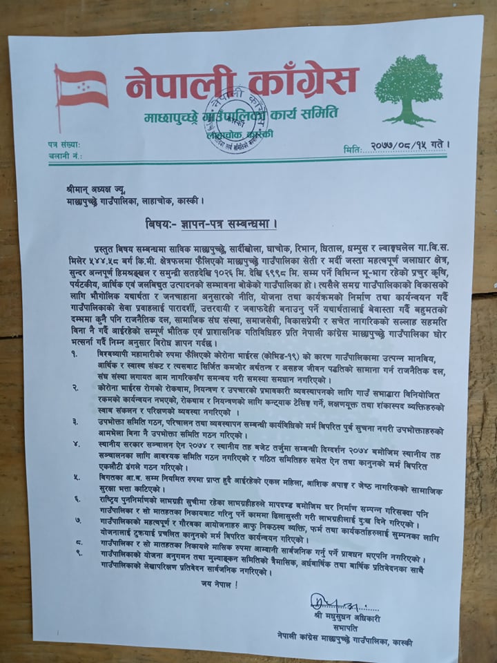 कास्की । माछापुच्छ्रे गाँउपालिकाको पछिल्लो गतिविधीको विरोध गर्दैै नेपाली कांग्रेस, माछापुच्छ्रे गाँउपालिका कार्य समितीले गाँउपालिका अध्यक्ष कर्ण बहादुर गुरुङलाई ज्ञापन पत्र बुझाएको छ I गाँउपालिकामा हुने गरेका विकाश निर्माणको काममा सरोकारवाला निकायहरुसंग सल्लाह नगरी काम गरेको प्रति असन्तुष्टी जनाउदै मंगलाबार गाँउपालिका अध्यक्ष गुरुङलाई ९ बुँदे ज्ञापनपत्र बुझाएको हो ।
